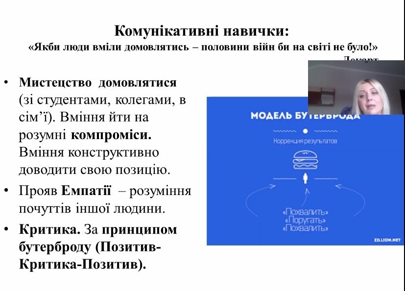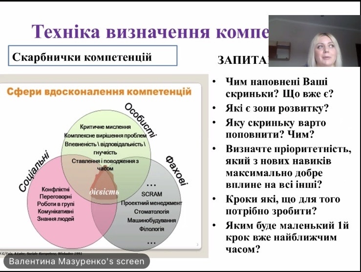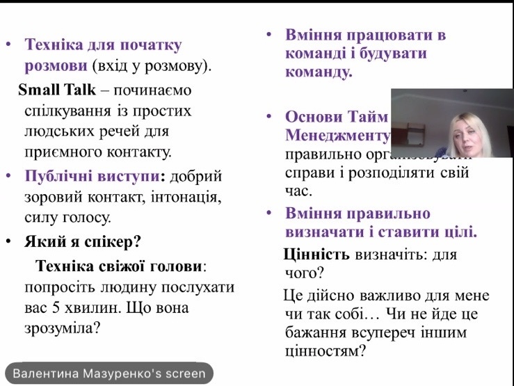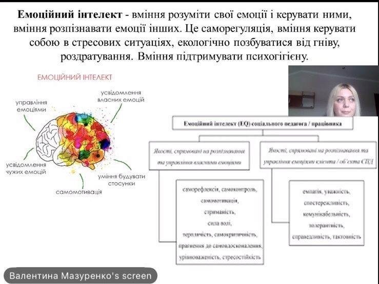Спікером зустрічі виступила практичний психолог Валентина МАЗУРЕНКО, яка допомогла майбутнім фахівцям розібратися, чому в сучасному світі професійна майстерність обов’язково має підкріплюватися розвиненим емоційним інтелектом та комунікативними здібностями.