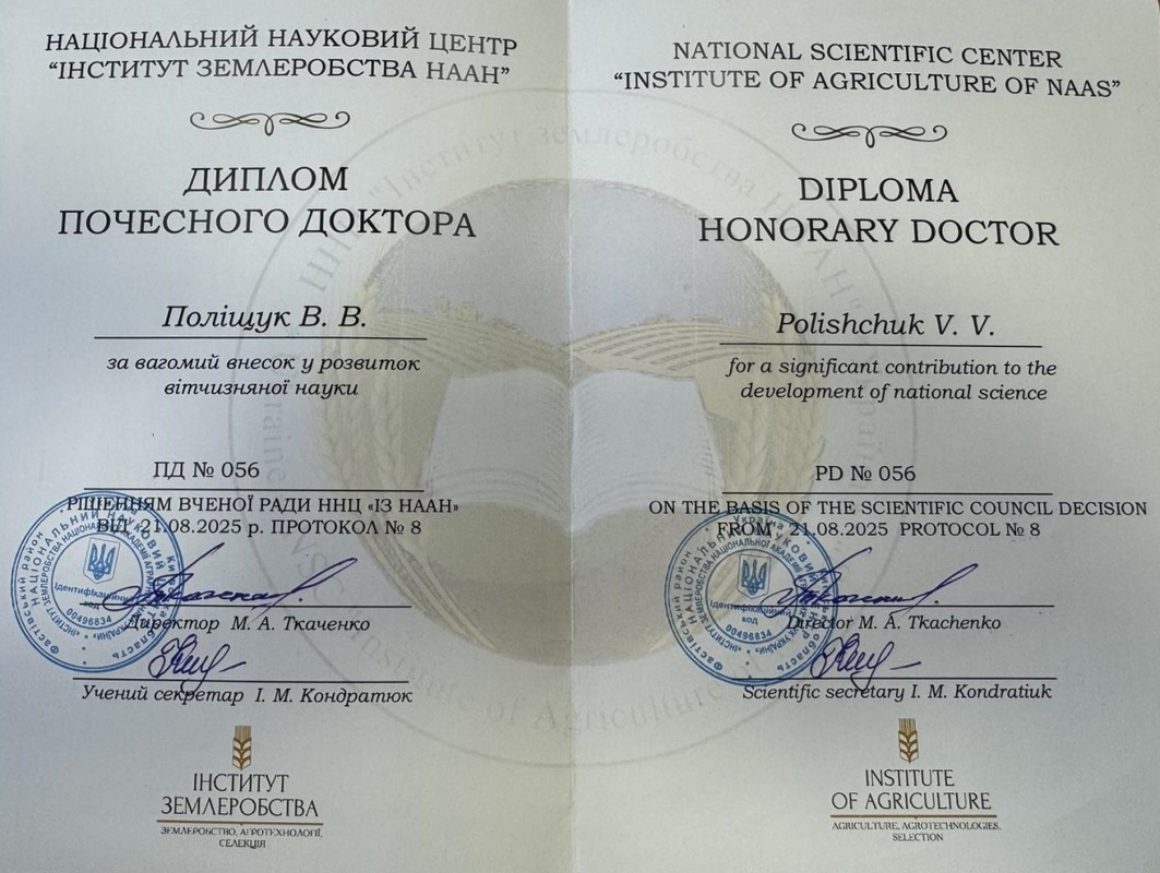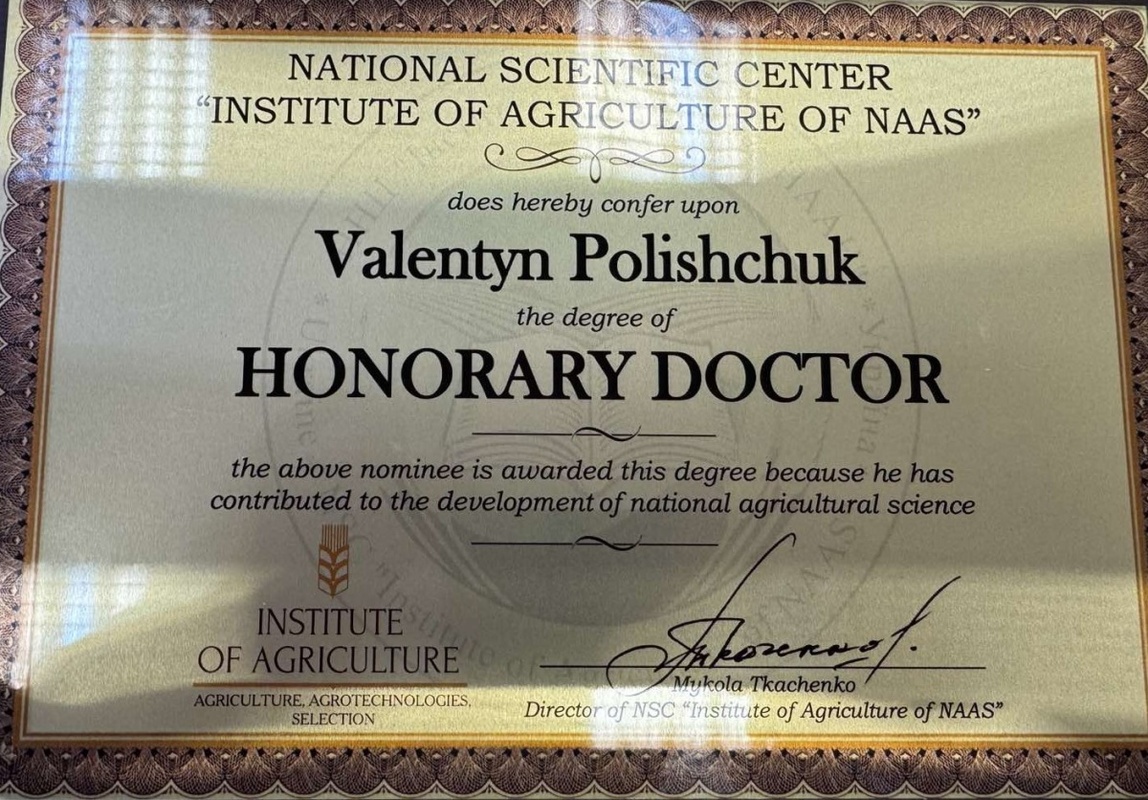 Щиро та сердечно вітаємо з нагородженням дипломом почесного доктора наук Національного наукового центру «Інститут землеробства НААН України» декана факультету лісового і садово-паркового господарства Уманського національного університету, доктора сільськогосподарських наук, професора, заслуженого працівника сільського господарства України, члена-кореспондента НААН України Валентина Васильовича ПОЛІЩУКА, яке відбулось з нагоди святкування 125-річчя Національного наукового центру «Інститут землеробства НААН України»!