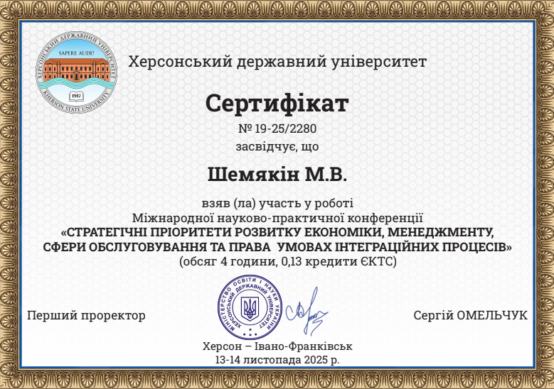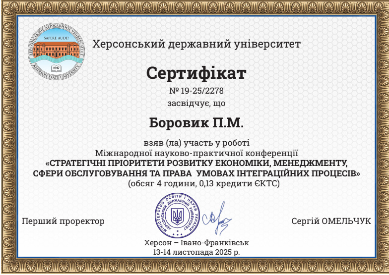 Участь у Міжнародній науково-практичній конференції «Стратегічні пріоритети розвитку економіки, менеджменту, сфери обслуговування та права в умовах інтеграційних процесів»