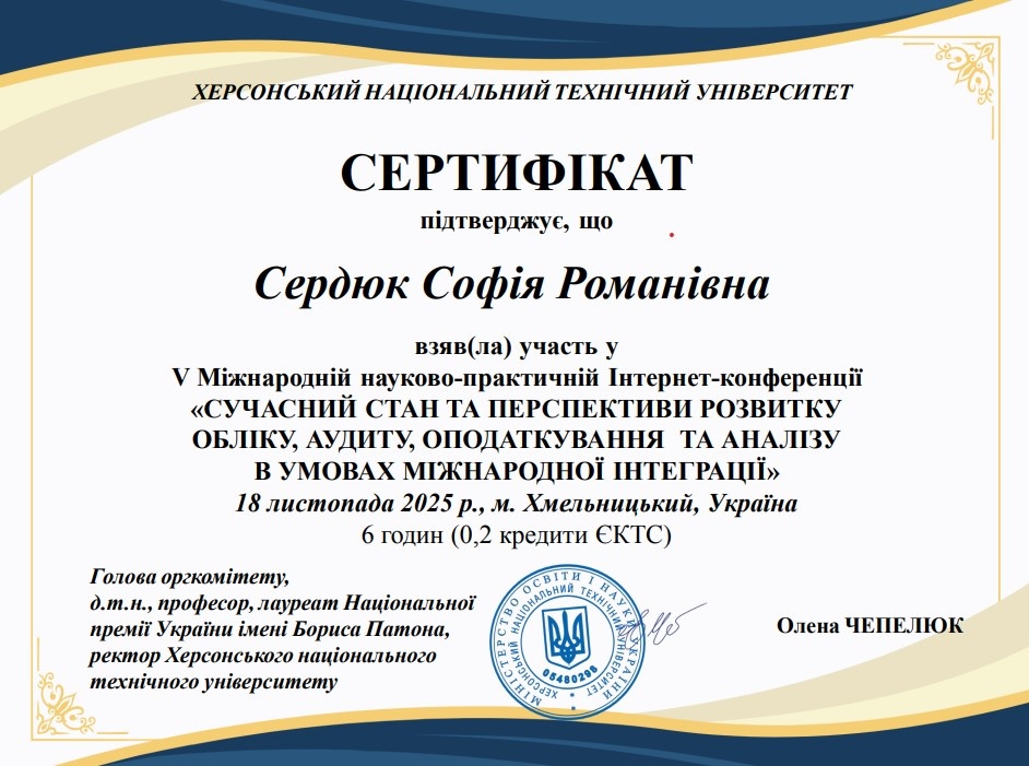 Студентка 21-зм групи спеціальності Геодезія та землеустрій бакалаврату факультету лісового і садово-паркового господарства Уманського національного університету Софія СЕРДЮК брала участь у V Міжнародній науково–практичній Інтернет-конференції «Сучасний стан та перспективи розвитку обліку, аудиту, оподаткування та аналізу в умовах міжнародної інтеграції», проведеній на базі Херсонського національного технічного університету.
