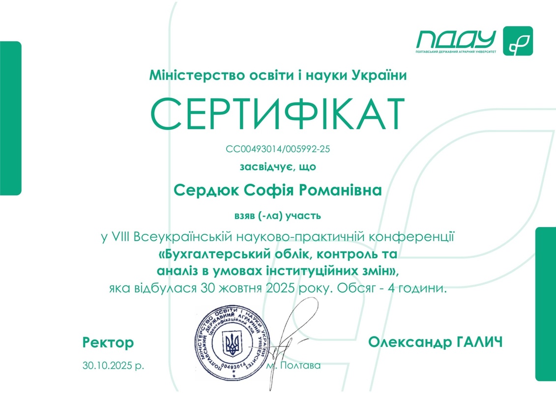 Нещодавно студентка 21-зм групи спеціальності Геодезія та землеустрій бакалаврату факультету лісового і садово-паркового господарства Уманського національного університету Софія СЕРДЮК брала участь у VIІІ Всеукраїнській науково-практичній конференції «Бухгалтерський облік, контроль та аналіз в умовах інституційних змін», яка була проведена в Полтавському державному аграрному університеті, м. Полтава, Україна.