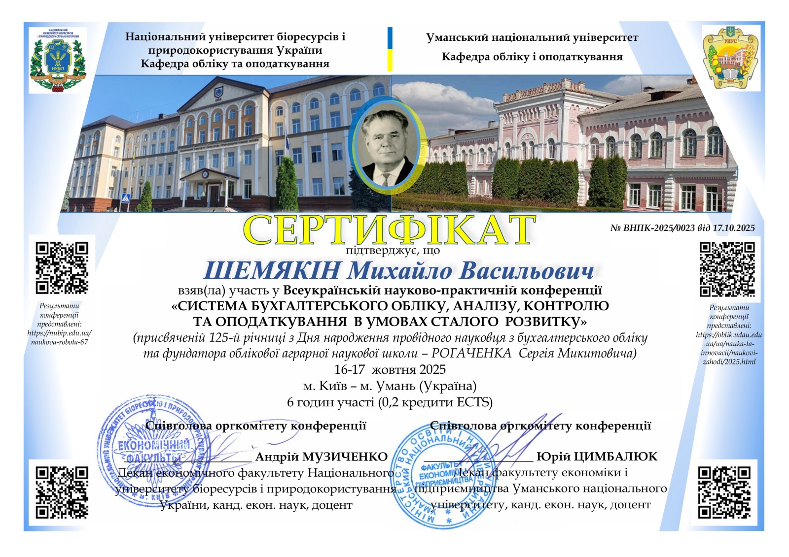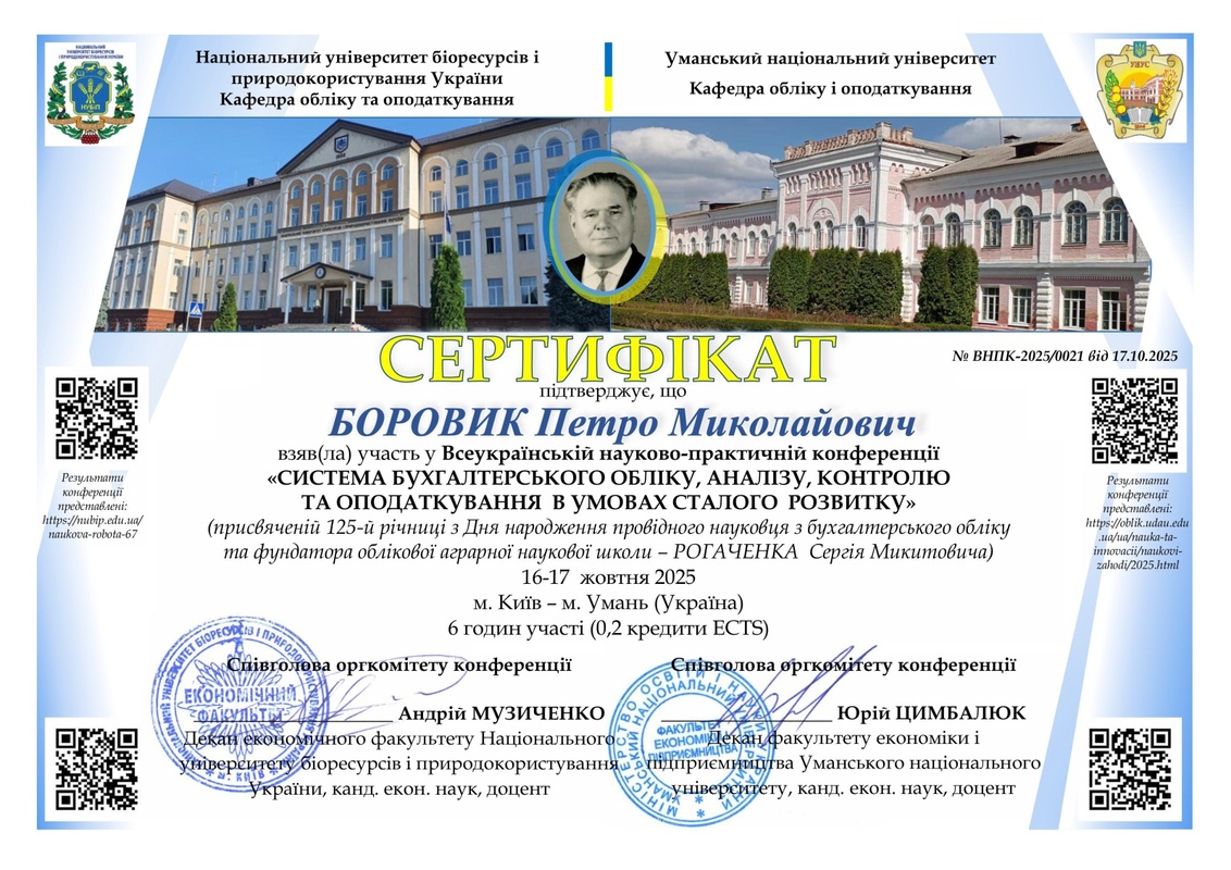 Проблеми обліку та оподаткування земельних ресурсів – один із фокусів наукових пошуків науково-педагогічних працівників кафедри геодезії, картографії і кадастру факультету лісового і садово-паркового господарства Уманського національного університету. Саме тому доценти Ірина УДОВЕНКО, Михайло ШЕМЯКІН та Петро БОРОВИК взяли участь у Всеукраїнській науково-практичній конференції «Система бухгалтерського обліку, аналізу, контролю та оподаткування в умовах сталого розвитку», присвяченій 125-й річниці з Дня народження провідного науковця з бухгалтерського обліку та фундатора облікової аграрної наукової школи – РОГАЧЕНКА Сергія Микитовича, нещодавно проведеній на базі кафедр обліку та оподаткування УНУ, а також обліку та оподаткування НУБІП.