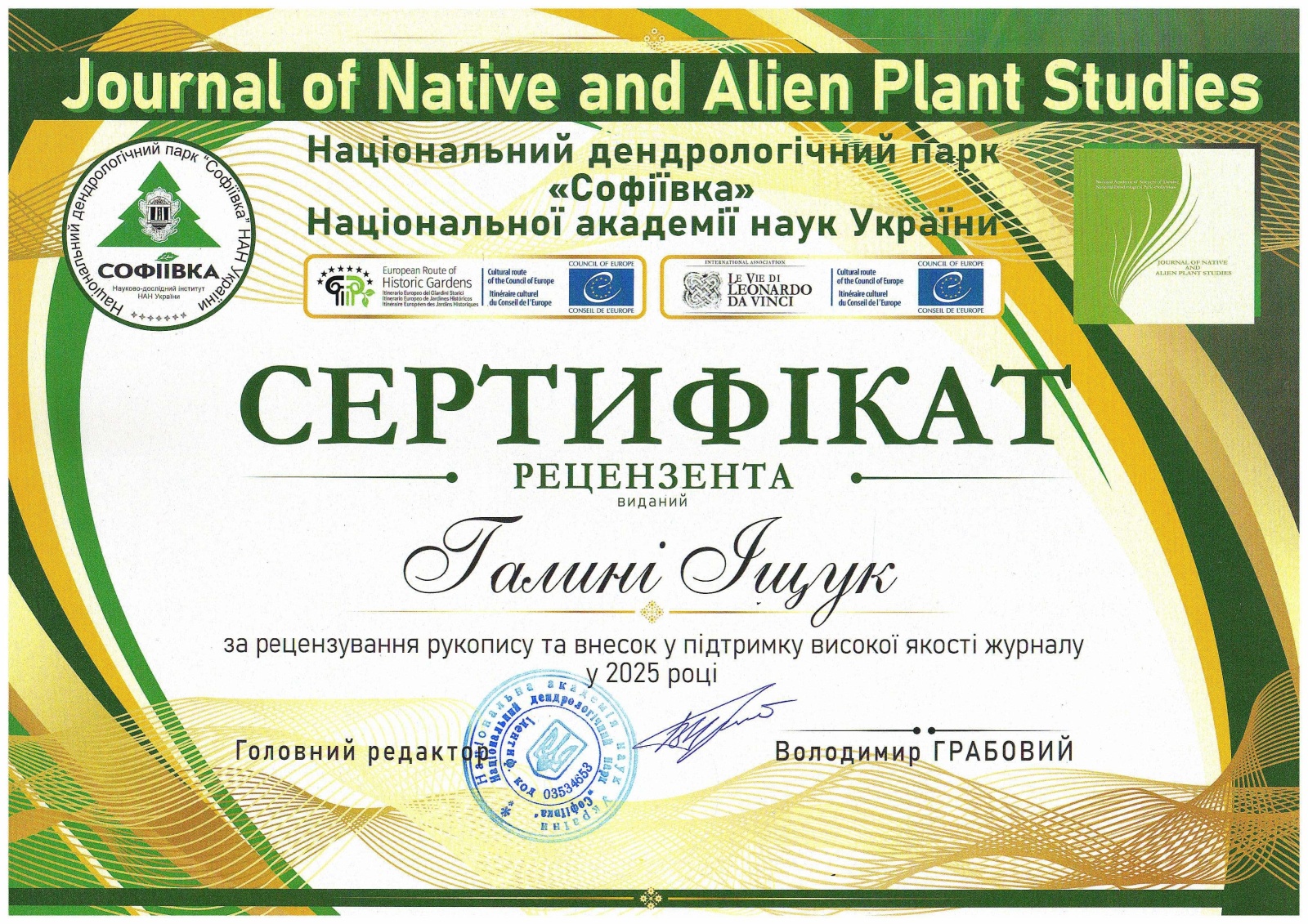 видання Journal of Native and Alien Plant Studies, відмічено сертифікатом рецензента, в якому засвідчено високу якість фахового рецензування нею наукових рукописів та дотримання високих стандартів академічної доброчесності.