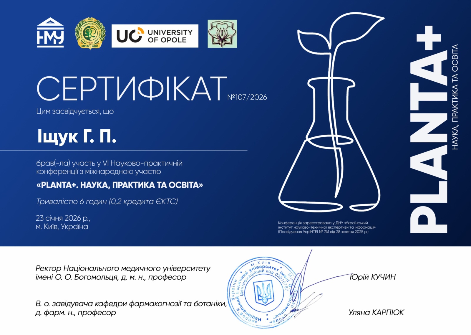 - у VI Науково-практичній конференції з міжнародною участю «PLANTA+. НАУКА, ПРАКТИКА ТА ОСВІТА».