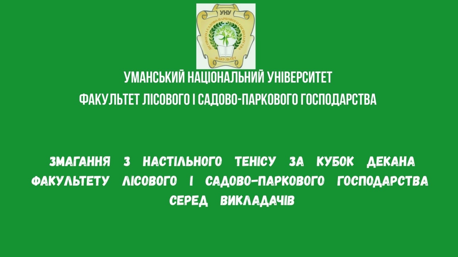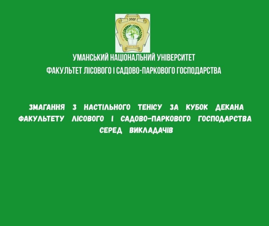 2 грудня 2025 року в стінах Уманського національного університету за спільної ініціативи декана факультету лісового і садово-паркового господарства Валентина ПОЛІЩУКА, а також кафедри фізичного виховання та психолого-педагогічних дисциплін, на факультеті лісового і садово-паркового господарства відбулися змагання серед викладачів з настільного тенісу за Кубок декана.